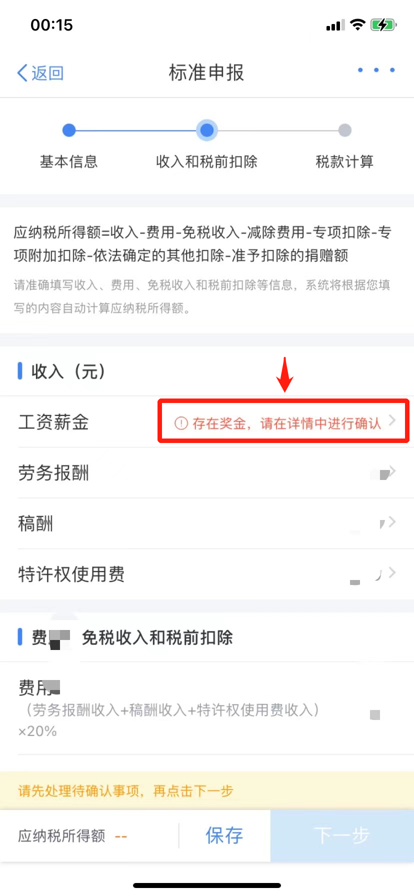 (六)查看“收入和税前扣除”信息,包括工资薪金、劳务报酬、稿酬和特许权使用费,点击最后的箭头可查看每种收入的明细。