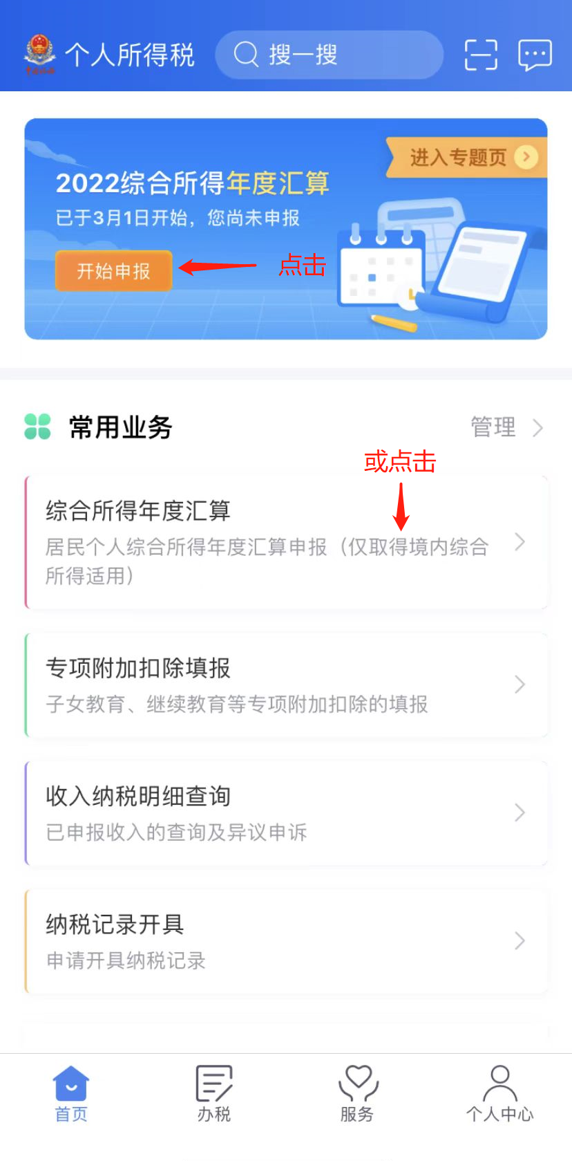 (一)打开并登陆“个人所得税”APP,点击“2022综合所得年度汇算”或“常用业务”下的“综合所得年度汇算”。