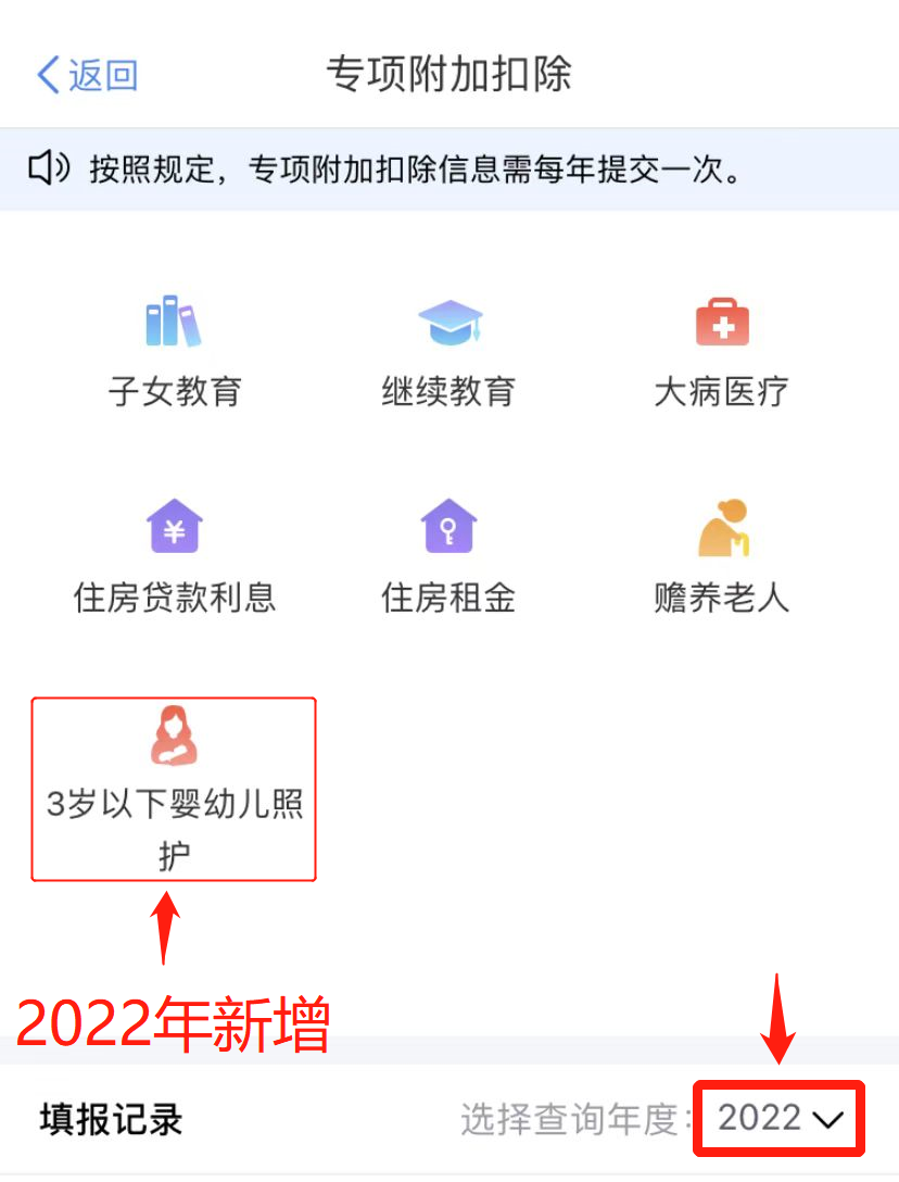 注意:2022年专项附加扣除新增“3岁以下婴幼儿照护”,请符合条件的纳税人按要求填写。