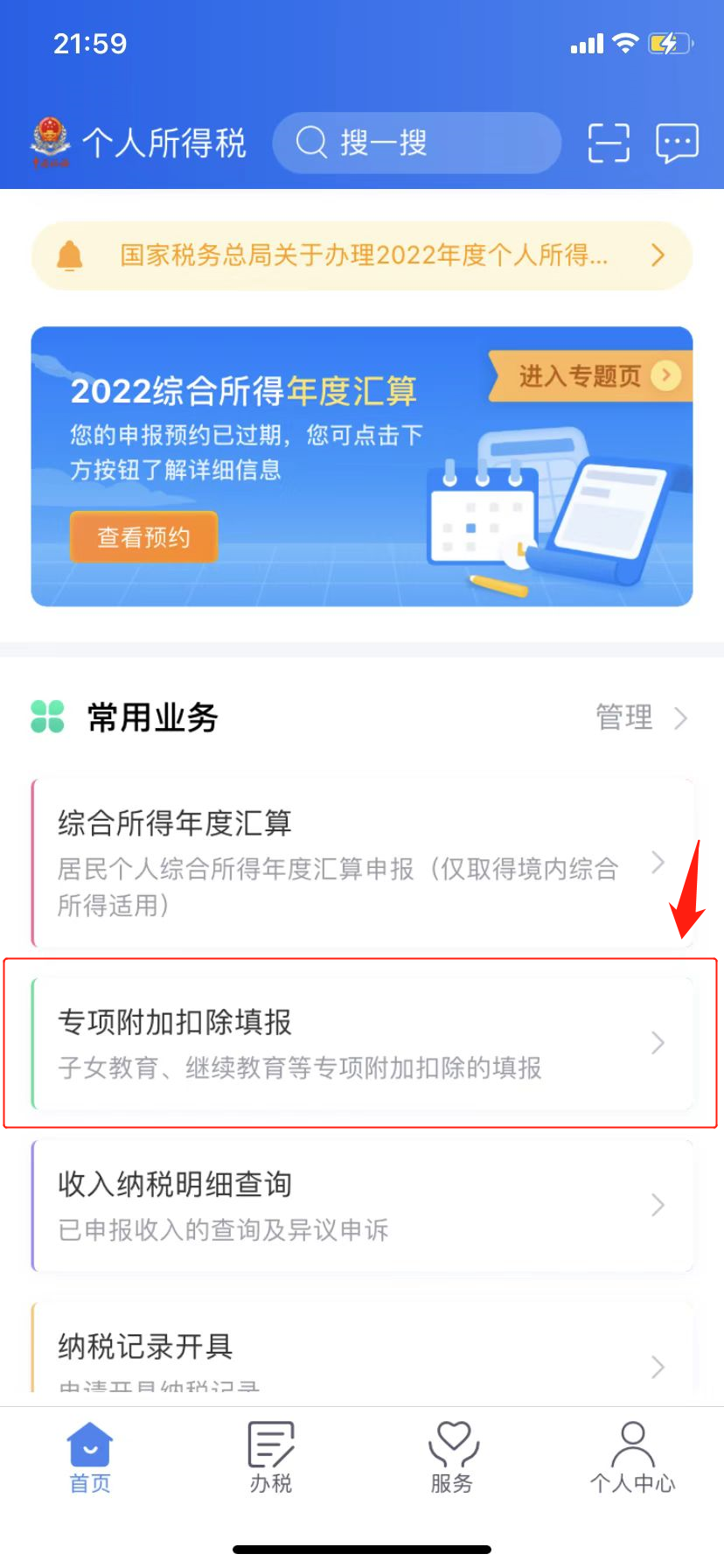 第一步:登录后,点击首页“专项附加扣除填报”。