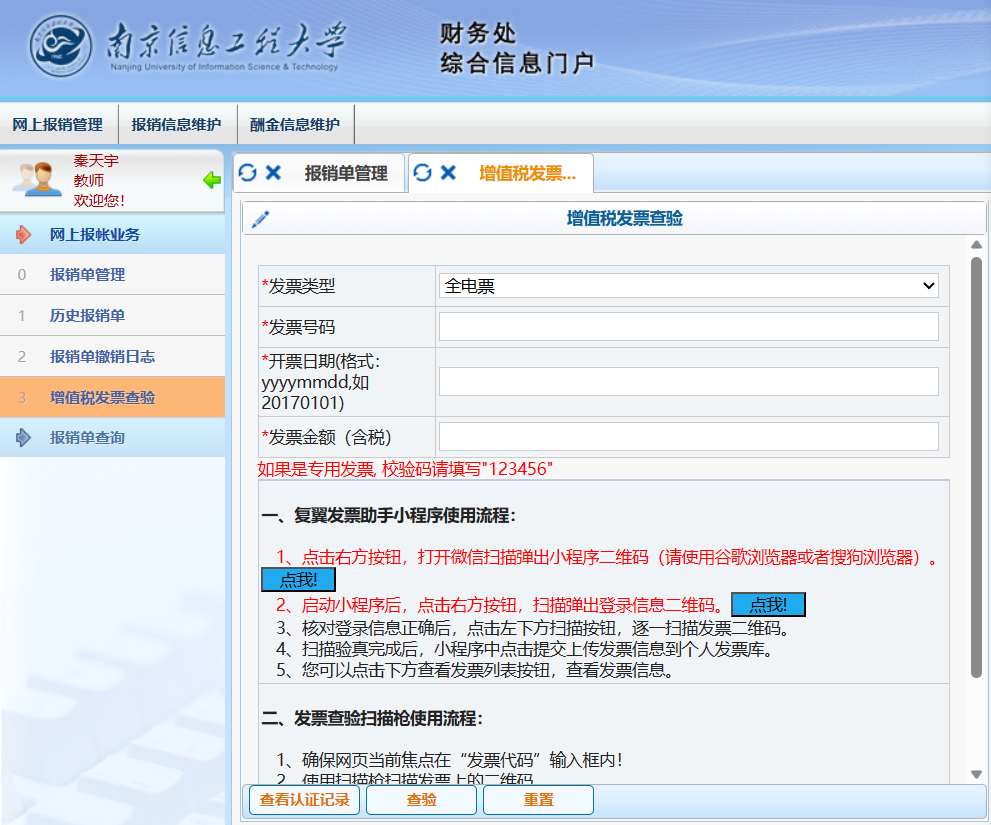 认证方式一(小翼Plus):登录财务系统,依次点击【网上预约报账】→【增值税发票查验】→点击第一个【点我】→微信扫描打开小程序:小翼Plus→点击第二个【点我】,绑定账号(可以将小程序发送手机桌面)→扫描发票二维码进行认证。