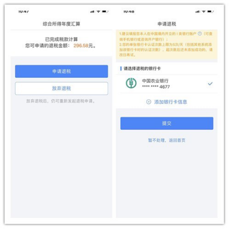(七)完成税款计算后,可查看退税金额,点击“申请退税”,并选择退税银行卡。