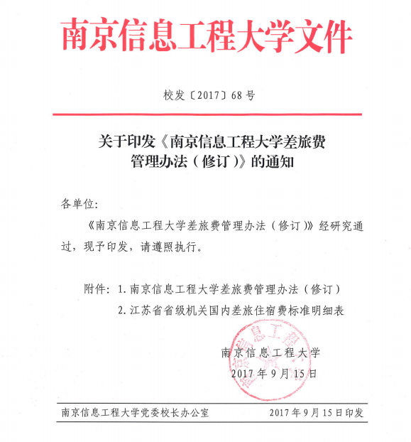 下载附件:南信大校发〔2017〕68号 附件1:南京信息工程大学差旅费管理办法(修订)