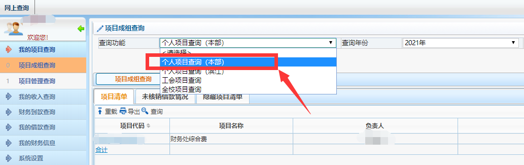 (二)如下图,查询功能框需选择【个人项目查询(本部)】,找到相应的项目,点击【项目代码】。