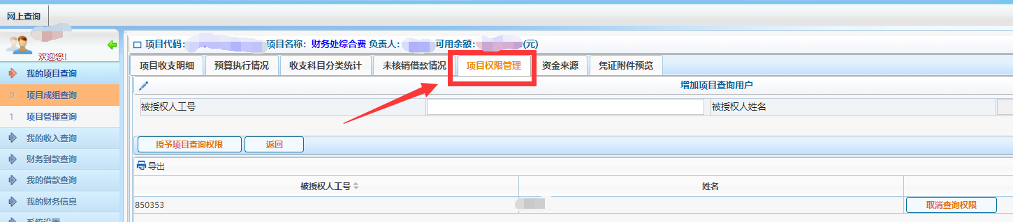 (三)点击【项目权限管理】,输入被授权人的工号后点击【授予项目查询权限】。温馨提示:项目负责人只能授予他人查询权限,无管理权限,被授权人无权授予他人查询权限。