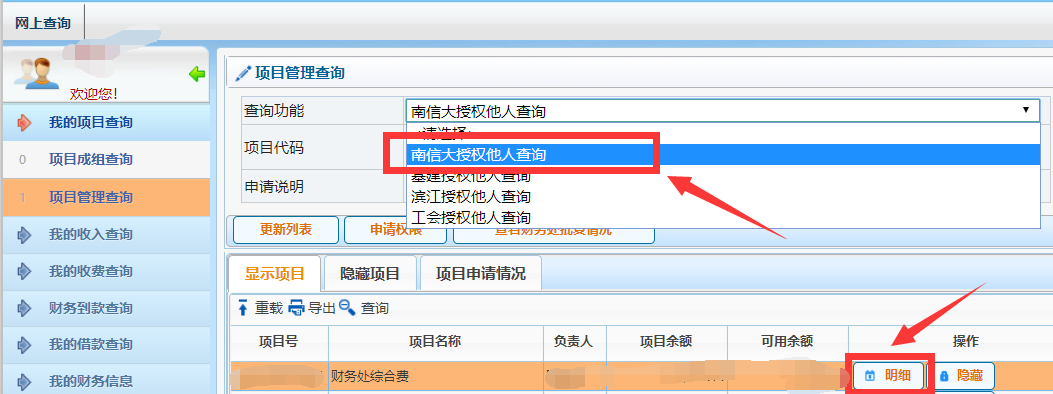 (二)如图,查询功能框需选择【南信大授权他人查询】,找到相应的项目,点击【明细】。